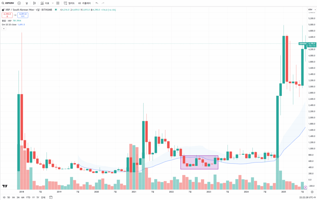 리플 월봉 차트에 엔벨로프(Envelope)를 적용해 보면, 2021년 급등 이후 2022~2023년에 걸친 길고 낮은 박스 구간이 또렷합니다. 이 구간에서 하단 밴드(기준: 20개월 MA, ±20~30%)를 반복적으로 터치하며 저평가 신호를 주었지만, 실전에서는 두 가지 벽에 부딪힙니다. ① 애초에 XRP를 선택할 수 있었는가, ② 그 자리에서 실제로 매수할 수 있었는가. 이 질문을 통과하지 못하면, 지표가 아무리 답을 제시해도 성과로 이어지지 않습니다.