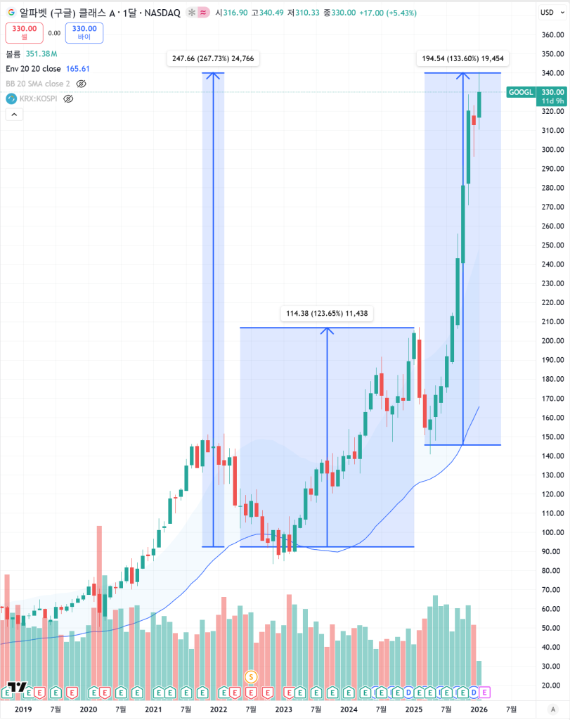 알파벳은 미래를 맞히지 않아도 되는 종목이다. 대신, 언제 비쌀 확률이 높고 언제 쌀 확률이 높은지를 구분하는 것이 중요하다. 엔벨로프는 바로 그 질문에 답해주는 도구다. 대장주 투자에서 수익의 상당 부분은 ‘정보’가 아니라 가격대 선택에서 나온다는 점을, 알파벳의 차트는 반복해서 증명하고 있다.