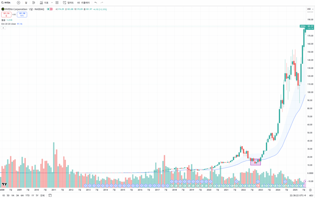 엔비디아(NVDA) 월봉 차트를 엔벨로프(20개월·±20% 기준)로 보면 2022년 하락기 초입에 하단 밴드 접촉–이탈–체류가 연속해서 나타납니다. 그 즈음 기사들은 실적 둔화와 수요 둔화를 크게 다뤘습니다. 그때도 살 수 있었을까 생각해보면 제 답은 **“뉴스로는 못 산다, 가격으로는 살 수 있다”**입니다. 뉴스는 이미 일어난 일을 요약하고, 가격은 현재의 공포 수준을 수치로 보여주기 때문입니다. 이후 AI 슈퍼사이클이 열리면서 2023~2025년 랠리는 “그때 가격이 얼마나 저렴했나”를 증명했습니다.